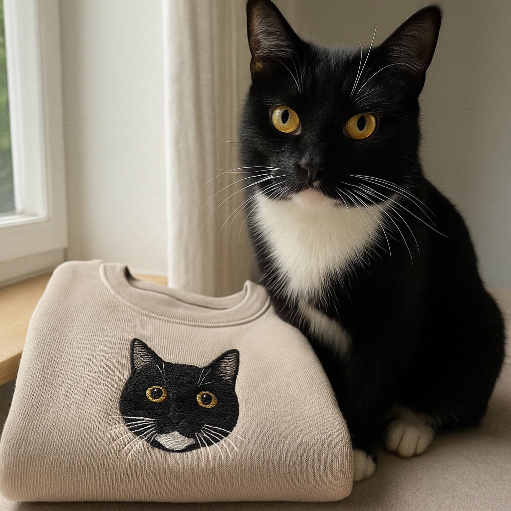 Watch the magic happen! We turn your favourite photos into hand-drawn line art and embroider them onto cosy, sustainable clothing. Every stitch tells your story, one thread at a time.